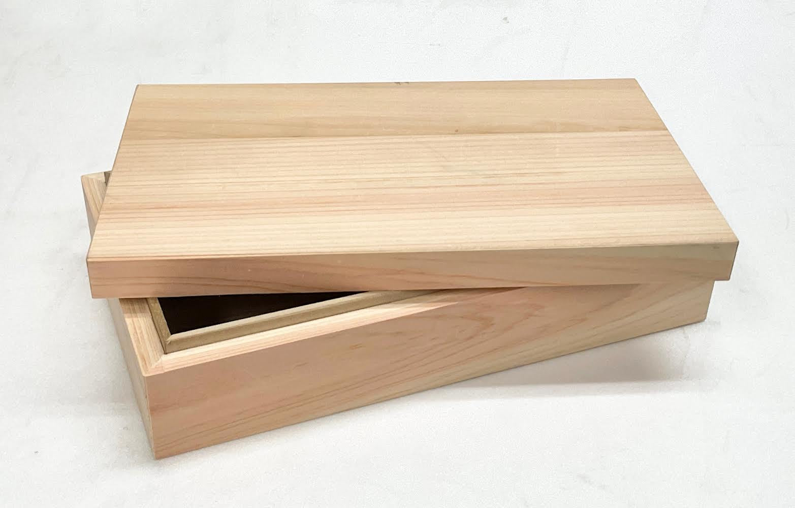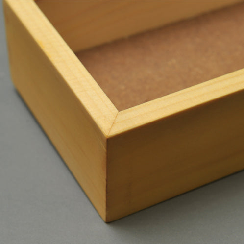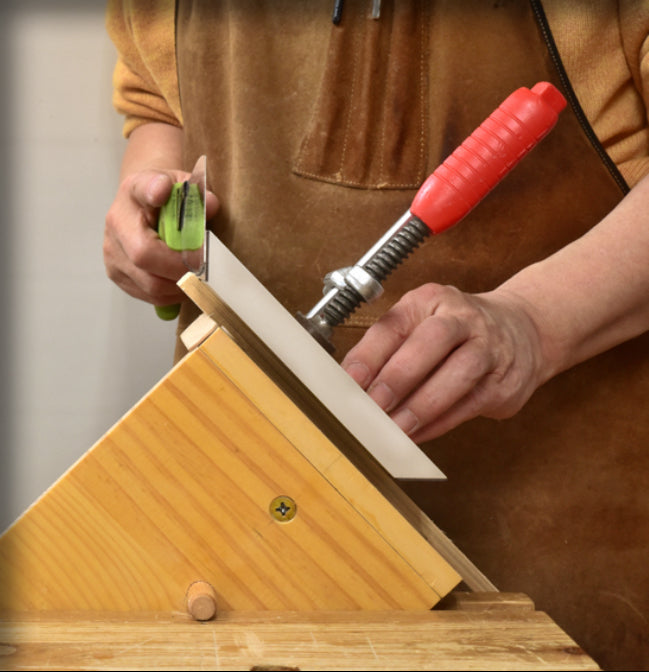 A box cut with a case miter joint will have a clean and beautiful appearance because the ends are concealed, but making this can be a difficult task. Following Sugita's Woodworking Method, the aim is to complete the miter joint by simply cutting with a hand saw, without trimming to fit with a hand plane or other tools. The results are in line with this aim. When cutting the board, the saw is tilted 45 degrees and special attention needs to be paid to pulling the saw straight. The Aluminum Case Miter Jig is also designed to use with the MIRAI a265 Flush Cut Pull Saw Blade.